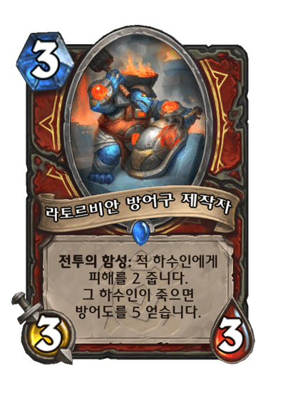 | 효과 | 전투의 함성: 적 하수인에게 피해를 2 줍니다. 그 하수인이 죽으면 방어도를 5 얻습니다. |