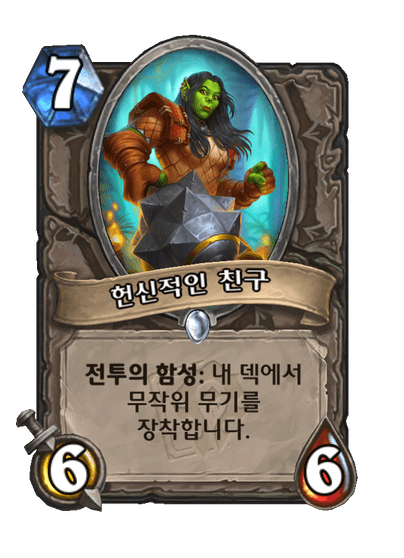 | 효과 | 전투의 함성: 내 덱에서 무작위 무기를 장착합니다. |