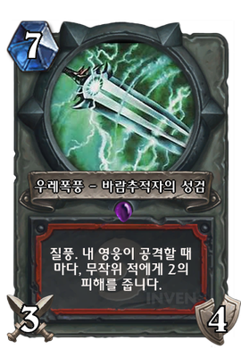 | 효과 | 질풍. 내 영웅이 공격할 때마다, 무작위 적에게 2의 피해를 줍니다. | ||