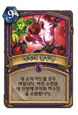 | 효과 | 내 손의 카드를 모두 버립니다. 버린 수만큼 내 전장에 무작위 하수인을 소환합니다. |
