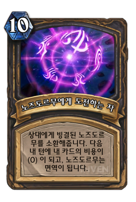 | 효과 | 상대에게 빙결된 노즈도르무를 소환해줍니다. 다음 내 턴에 내 카드의 비용이 (0) 이 되고, 노즈도르무는 면역이 됩니다. | ||