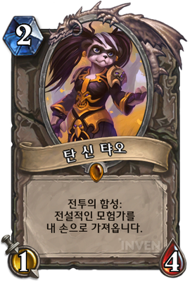 | 부연 설명 | [동방제과] (3/2/5) 모든 주문과 영웅 능력의 대상이 이 하수인으로 고정됩니다. "브레스!! 피해욧!! 구석으로!!" // [합장비둘] (3/2/5) 두 플레이어는 카드의 효과로 하수인을 소환할 수 없습니다. "미쳤소?! 합장비둘!" // [국그릇] (3/2/5) 무기와 비밀의 비용이 (2) 증가합니다. "어떻게 감히 그걸 벼릴 수 있단 말인가, 국그릇?" |