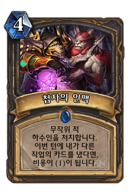 | 효과 | 무작위 적 하수인을 처치합니다. 이번 턴에 내가 다른 직업의 카드를 냈다면, 비용이 (1)이 됩니다. |