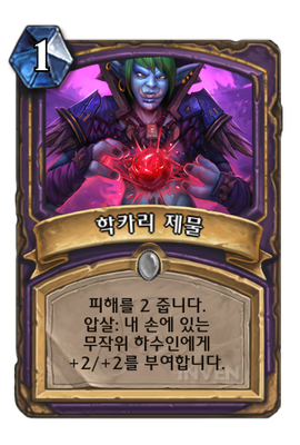 | 효과 | 피해를 2 줍니다. 압살: 내 손에 있는 무작위 하수인에게 +2/+2를 부여합니다. |
