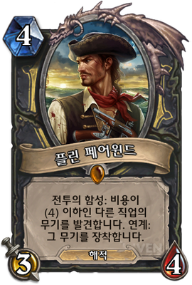 | 효과 | 전투의 함성: 비용이 (4) 이하인 다른 직업의 무기를 발견합니다. 연계: 그 무기를 장착합니다. |