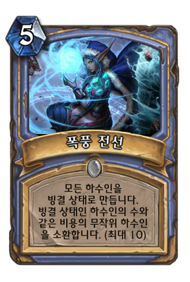 | 효과 | 모든 하수인을 빙결 상태로 만듭니다. 빙결 상태인 하수인의 수와 같은 비용의 무작위 하수인 을 소환합니다. (최대 10) |