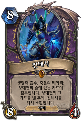 | 효과 | 생명력 흡수, 죽음의 메아리: 상대편의 손에 있는 카드에 침투합니다. 상대편이 그 카드를 낸 후에, 킨테사를 다시 소환합니다. |
