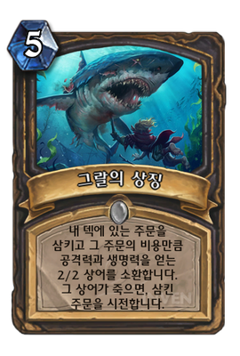 | 효과 | 내 덱에 있는 주문을 삼키고 그 주문의 비용만큼 공격력과 생명력을 얻는 2/2 상어를 소환합니다. 그 상어가 죽으면, 삼킨 주문을 시전합니다. |