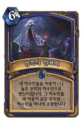 | 효과 | 내 하수인들을 비용이 (1) 높은 무작위 하수인으로 변신시킵니다, 그 하수인들 과 비용이 같은 무작위 하수인을 하나씩 소환합니다 |