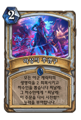 | 효과 | 모든 아군 캐릭터의 생명력을 2 회복시키고 하수인을 뽑습니다 피날레: 그 하수인에게 "피날레: 이 주문을 다시 시전함" 능력을 부여합니다. |