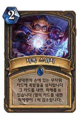 | 효과 | 상대편의 손에 있는 무작위 카드에 폭발물을 설치합니다 그 카드를 내면, 피해를 8 입습니다 (옆의 카드를 내면 피해량이 1씩 감소합니다) |