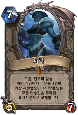 | 효과 | 도발, 전투의 함성: 이번 게임에서 주문을 10회 이상 시전했으면, 내 덱에 있는 모든 하수인을 무작위 요그사론으로 교체합니다. |