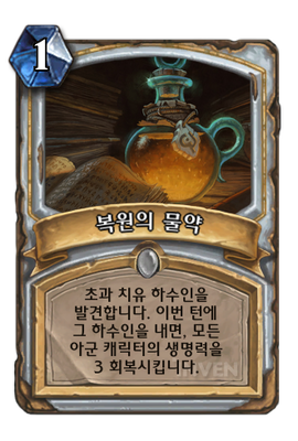 | 효과 | 초과 치유 하수인을 발견합니다. 이번 턴에 그 하수인을 내면, 모든 아군 캐릭터의 생명력을 3 회복시킵니다. |