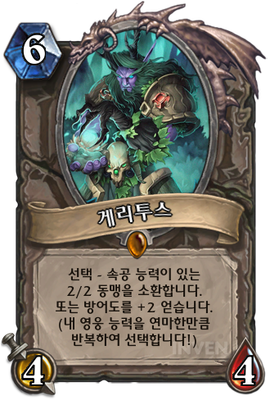 | 효과 | 선택 - 속공 능력이 있는 2/2 동맹을 소환합니다. 또는 방어도를 +2 얻습니다. (내 영웅 능력을 연마한만큼 반복하여 선택합니다!) |