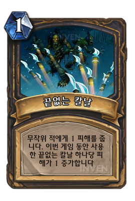 | 효과 | 무작위 적에게 1 피해를 줍니다. 이번 게임 동안 사용한 끝없는 칼날 하나당 피해가 1 증가합니다 | ||