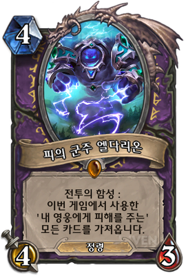 | 효과 | 전투의 함성 : 이번 게임에서 사용한 '내 영웅에게 피해를 주는' 모든 카드를 가져옵니다. |