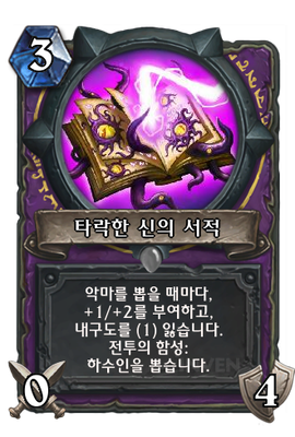 | 효과 | 악마를 뽑을 때마다, +1/+2를 부여하고, 내구도를 (1) 잃습니다. 전투의 함성: 하수인을 뽑습니다. |