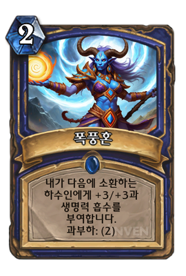 | 효과 | 내가 다음에 소환하는 하수인에게 +3/+3과 생명력 흡수를 부여합니다. 과부하: (2) |