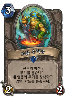 | 효과 | 전투의 함성 : 무기를 뽑습니다. 내 영웅이 무기를 장착하고 있면, 카드를 뽑습니다. |