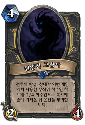 | 효과 | 전투의 함성: 상대가 이번 게임에서 사용한 무작위 하수인 하나를 2/4 하수인으로 복사해 손에 가져온 뒤 은신을 부여합니다. | ||