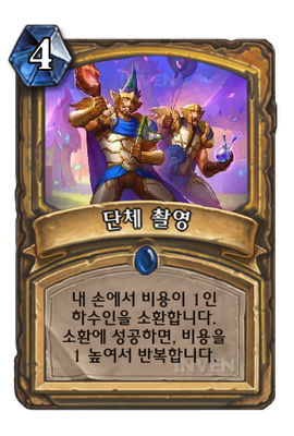 | 효과 | 내 손에서 비용이 1인 하수인을 소환합니다. 소환에 성공하면, 비용을 1 높여서 반복합니다. |