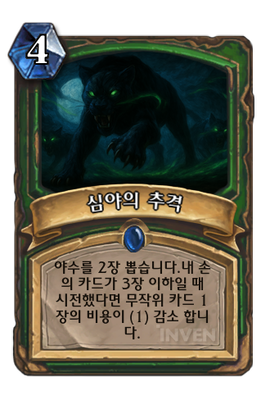 | 효과 | 야수를 2장 뽑습니다.내 손의 카드가 3장 이하일 때 시전했다면 무작위 카드 1장의 비용이 (1) 감소 합니다. | ||