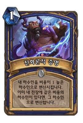 | 효과 | 내 하수인을 비용이 1 높은 하수인으로 변신시킵니다. 이미 내 전장에 같은 비용의 하수인이 있다면, 그 하수인으로 변신합니다. |