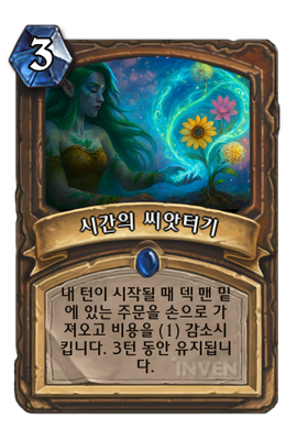 | 효과 | 내 턴이 시작될 때 덱 맨 밑에 있는 주문을 손으로 가져오고 비용을 (1) 감소시킵니다. 3턴 동안 유지됩니다. | ||