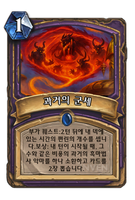 | 효과 | 부가 퀘스트:2턴 뒤에 내 덱에 있는 시간의 편린의 개수를 셉니다.보상: 내 턴이 시작될 때, 그 수와 같은 비용의 과거의 흑마법사 악마를 하나 소환하고 카드를 2장 뽑습니다. | ||