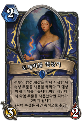| 효과 | 전투의 함성:대상을 하나 지정한 뒤 속성 주문을 사용할 때마다 그 대상에게 피해를 1줍니다.이번 게임에서 화염 주문을 사용했다면 피해가 2배가 됩니다 (피해 속성은 자연 속성으로 취급) |