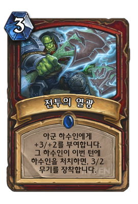 | 효과 | 아군 하수인에게 +3/+2를 부여합니다. 그 하수인이 이번 턴에 하수인을 처치하면, 3/2 무기를 장착합니다. |