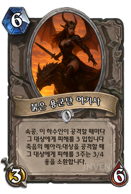 | 효과 | 속공, 이 하수인이 공격할 때마다 그 대상에게 피해를 3 입힙니다 죽음의 메아리:대상을 공격할 때 그 대상에게 피해를 3주는 3/4 용을 소환합니다. | ||