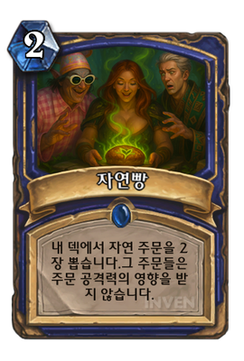 | 효과 | 내 덱에서 자연 주문을 2장 뽑습니다.그 주문들은 주문 공격력의 영향을 받지 않습니다. | ||