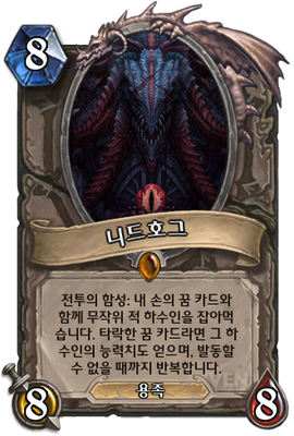 | 효과 | 전투의 함성: 내 손의 꿈 카드와 함께 무작위 적 하수인을 잡아먹습니다. 타락한 꿈 카드라면 그 하수인의 능력치도 얻으며, 발동할 수 없을 때까지 반복합니다. | ||