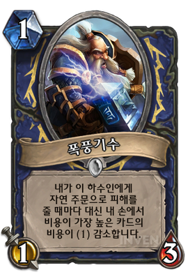 | 효과 | 내가 이 하수인에게 자연 주문으로 피해를 줄 때마다 대신 내 손에서 비용이 가장 높은 카드의 비용이 (1) 감소합니다. |