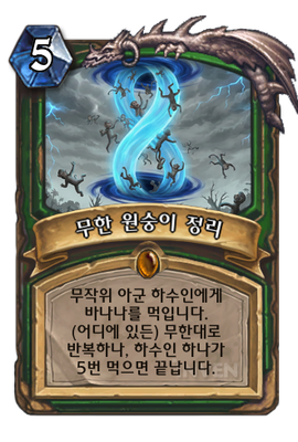 | 효과 | 무작위 아군 하수인에게 바나나를 먹입니다. (어디에 있든) 무한대로 반복하나, 하수인 하나가 5번 먹으면 끝납니다. |