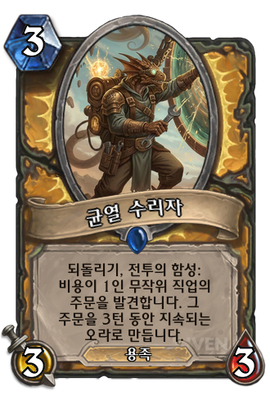| 효과 | 되돌리기, 전투의 함성: 비용이 1인 무작위 직업의 주문을 발견합니다. 그 주문을 3턴 동안 지속되는 오라로 만듭니다. |