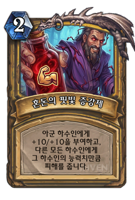 | 효과 | 아군 하수인에게 +10/+10을 부여하고, 다른 모든 하수인에게 그 하수인의 능력치만큼 피해를 줍니다. |