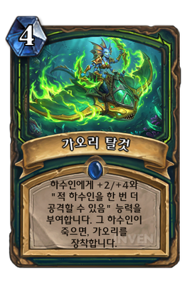 | 효과 | 하수인에게 +2/+4와 "적 하수인을 한 번 더 공격할 수 있음" 능력을 부여합니다. 그 하수인이 죽으면, 가오리를 장착합니다. |