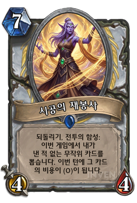 | 효과 | 되돌리기, 전투의 함성: 이번 게임에서 내가 낸 적 없는 무작위 카드를 뽑습니다. 이번 턴에 그 카드 의 비용이 (0)이 됩니다. |