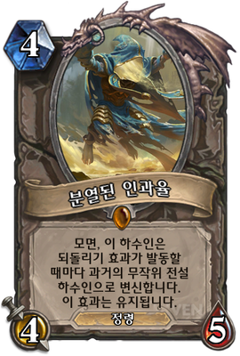 | 효과 | 모면, 이 하수인은 되돌리기 효과가 발동할 때마다 과거의 무작위 전설 하수인으로 변신합니다. 이 효과는 유지됩니다. |
