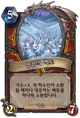 | 부연 설명 | 소환 즉시 현재 적 전장의 하수인들만큼 대응하는 백토를 소환합니다. 거수 부위: (대응 하수인의 이름)의 백토 1코 0/1 야수, 죽음의 메아리: (대응하는 하수인)이 죽습니다. 이 세상 모든 생명에게는 각자 자기들만의 새하얀 토끼가 한 마리 존재한다고 전해진다. |