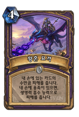 | 효과 | 내 손에 있는 카드의 수만큼 피해를 줍니다. 내 손에 용족이 있으면, 생명력 흡수 능력으로 피해를 줍니다. |