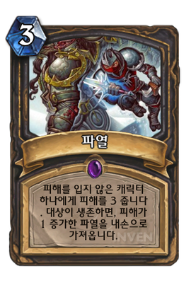 | 효과 | 피해를 입지 않은 캐릭터 하나에게 피해를 3 줍니다. 대상이 생존하면, 피해가 1 증가한 파열을 내손으로 가져옵니다. | ||