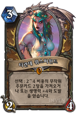 | 효과 | 선택 : 2~4 비용의 무작위 주문카드 2장을 가져오거나 또는 생명력 +4와 도발을 얻습니다. | ||