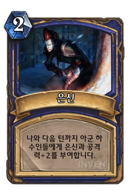 | 효과 | 나와 다음 턴까지 아군 하수인들에게 은신과 공격력+2를 부여합니다. | ||