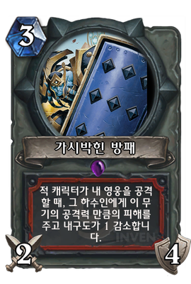 | 효과 | 적 캐릭터가 내 영웅을 공격할 때, 그 하수인에게 이 무기의 공격력 만큼의 피해를 주고 내구도가 1 감소합니다. | ||