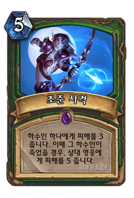 | 효과 | 하수인 하나에게 피해를 3 줍니다. 이때 그 하수인이 죽었을 경우, 상대 영웅에게 피해를 5 줍니다. | ||