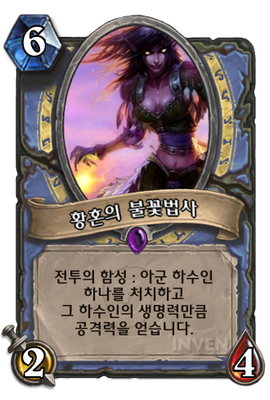 | 효과 | 전투의 함성 : 아군 하수인 하나를 처치하고 그 하수인의 생명력만큼 공격력을 얻습니다. |