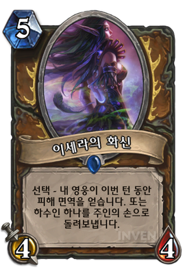| 효과 | 선택 - 내 영웅이 이번 턴 동안 피해 면역을 얻습니다. 또는 하수인 하나를 주인의 손으로 돌려보냅니다. | ||